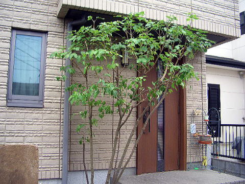 玄関脇のヤマボウシの剪定、庭のヤマモモ、シダレモモの剪定です。