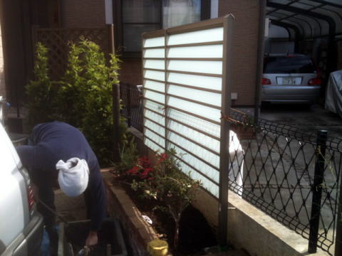 目隠し効果があり、このように手前が花壇の場合でも植物に光が入るフェンスを設置させていただきました。