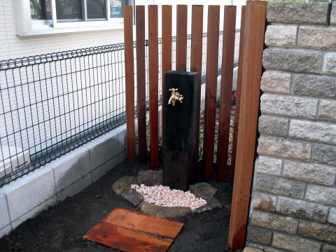 ウリンのスリットの裏には手造りの立水栓を