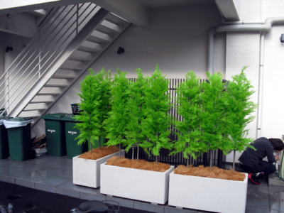 最近のフェイクグリーンは遠くからみると本物と見間違えるくらいのいい仕上がりです。