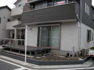 ウッドデッキの前部分には低木のコニファーのフィリフェラオーレアを植栽しました。