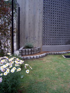 芝生だけだったお庭に奥様が好きなハーブを植えこむための花壇をつくりました。 素材はグレーのサンドストーン。インド産の砂岩です。 背景のコンクリートと違和感がない色にしましたので一体感があります。 植栽は大株のラベンダーだけで、ほかの部分が奥様がご自分を植えられます。