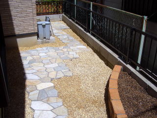 雑草が生えないようにと天然石のアプローチをつくり、全く土がなくなってしまうのはさみしいので 一番日当たりの良い部分にレンガで花壇をつくりました。