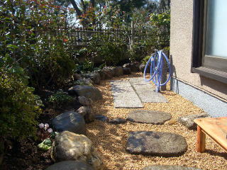 植木が大きくなり、その根の成長で土が盛り上がってしまい、土留めの石が土に埋もれて しまっていました。この庭を生き返らせるため、大きくなりすぎた植木をベニカナメの生垣に 植えかえ、土留めの石、飛び石を組み直し錆砂利を敷き詰めました。 施主様には、「庭らしくなった!」とお喜びいただけました。