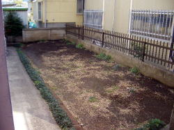 コンクリート部分の際がきたない状態でしたので、まっすぐに切り、以前からあったレンガを再利用して