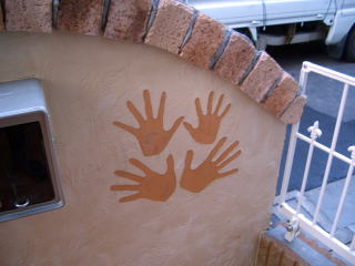 門袖は家の外壁のイメージに合うようレンガと塗り壁を使いました。色も質感も